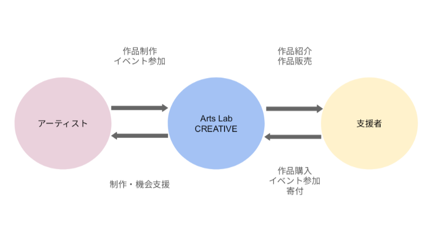 アーティストの作品や参加イベントをSNSなどで周知し、支援者の方に届け、支援の方が作品の購入やイベントに参加していただくことによってアーティストに制作や発表機会が提供される仕組みとなっています。